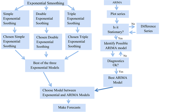 Two main classes of models are considered in this paper: The Exponential Smoothing (ES) and Autoregressive Integrated Moving Average (ARIMA) models. The first class involves the SES, DES and TES models. The three models will be analysed and the best fit model will be chosen depending on whether the data used will exhibit a level and/or trend and/or seasonality. The second class involves the ARIMA models with the following model-building process: Tentative identification of a model, Estimation of parameters in the identified model and Diagnostic checks. The Best fit from the two classes will finally be compared to
