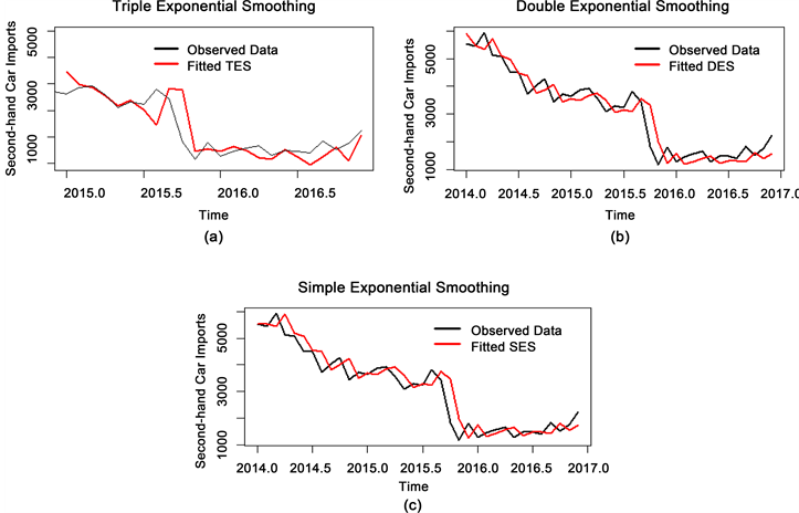 The importation of Second-hand Cars in Zambia presents a time series problem. There are several techniques that use time series but in this study we shall only concentrate on the Exponential Smoothing (ES) and Autoregressive Integrated Moving Average (ARIMA) models. In [5] , various smoothing techniques discussed include: The Simple Exponential Smoothing (SES) which is applied when the pattern is nearly horizontal; The Double Exponential Smoothing (DES) also known as the Holt’s Exponential Smoothing (HES) applied when data shows a trend; The Holt Winters (HW) also known as Triple Exponential Smoothing (TES) in which the data shows both trend and seasonality. The Best fit of the three models will be compared with the ARIMA model depending on whether the data used will exhibit a level and/or trend and/or seasonality. The ARIMA model is another method that is used to model and forecast time series data. The ARIMA models are also known as the “Box-Jenkins” approach following the work of Box and Jenkins [6] . This paper therefore, focuses on the major tools of decision making called univariate time-series-models.